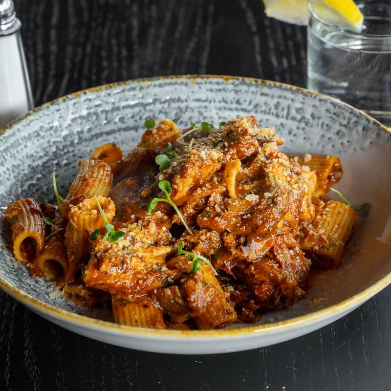 rigatoni, spinach, arugula, cherry tomatoes, herb oil, seasonal squash, basil, lemon cream sauce, chive oil